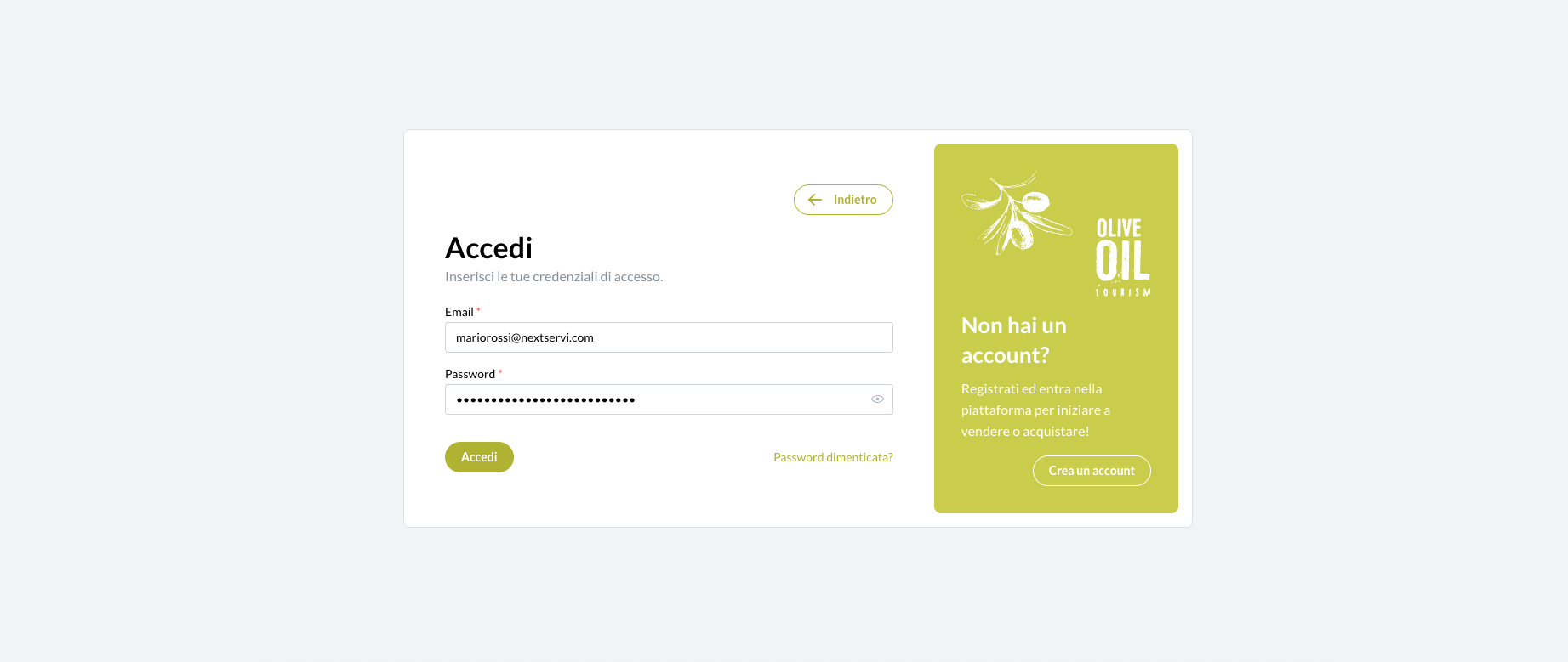 Dopo la registrazione, verrai reindirizzato alla pagina di login. Inserisci le stesse credenziali (email e password) scelte nella fase precedente per accedere alla tua area personale.