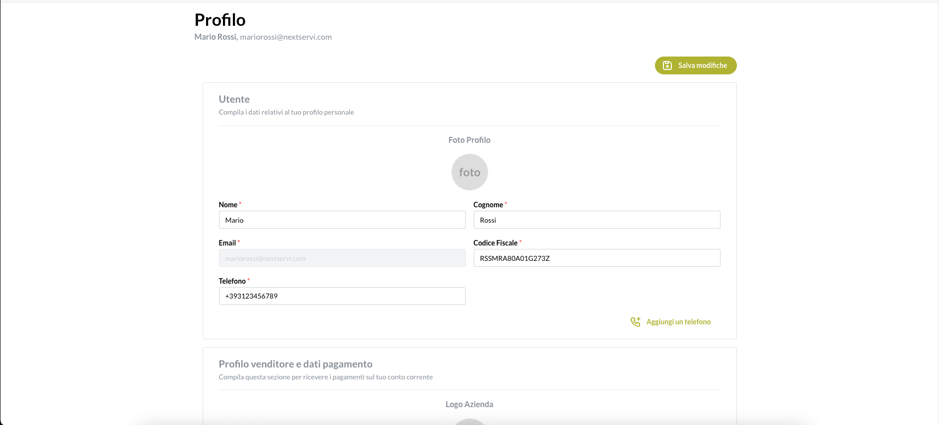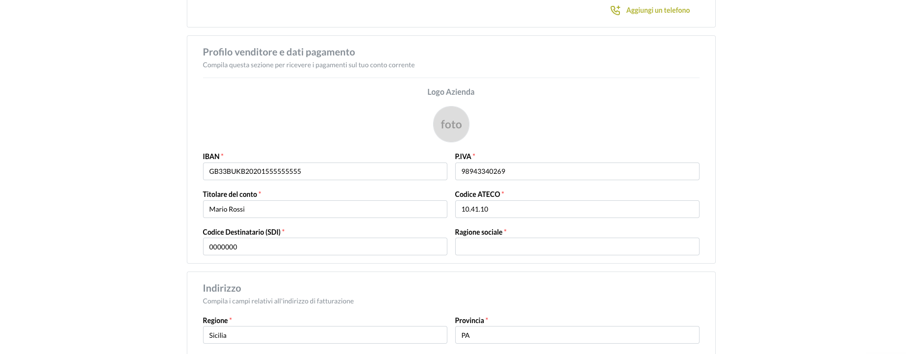 Una volta effettuato l’accesso, verrai indirizzato alla pagina del profilo venditore, dove dovrai completare tutte le informazioni obbligatorie contrassegnate da un asterisco (*)